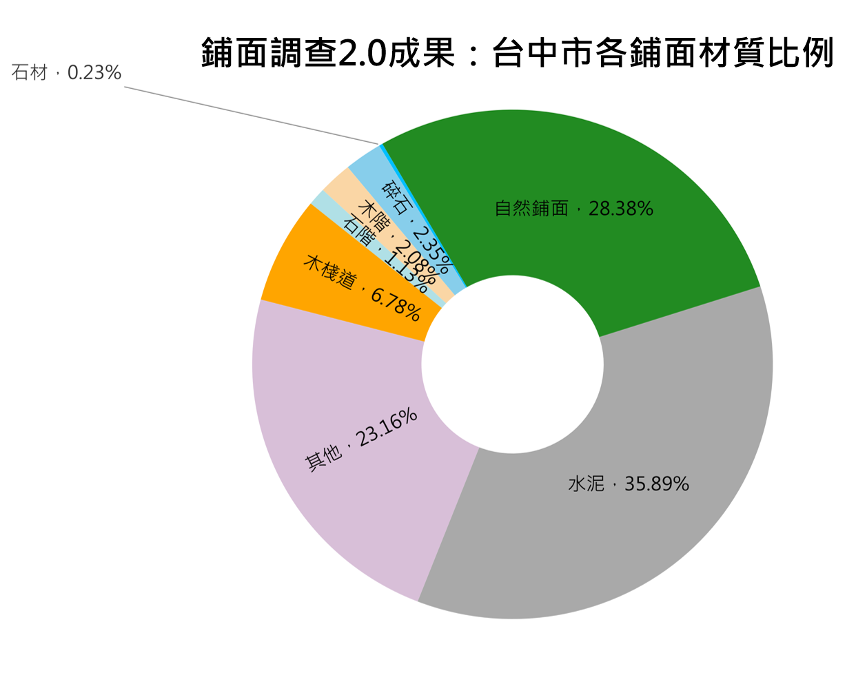 台中市,29條步道,調查總長54.3公里,水泥化比例36%、其他材質鋪面比例36%、純自然鋪面比例28%