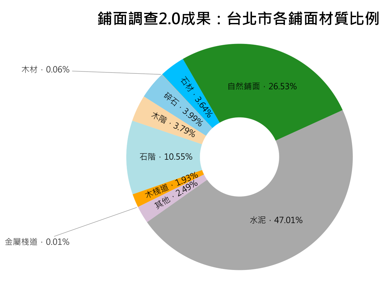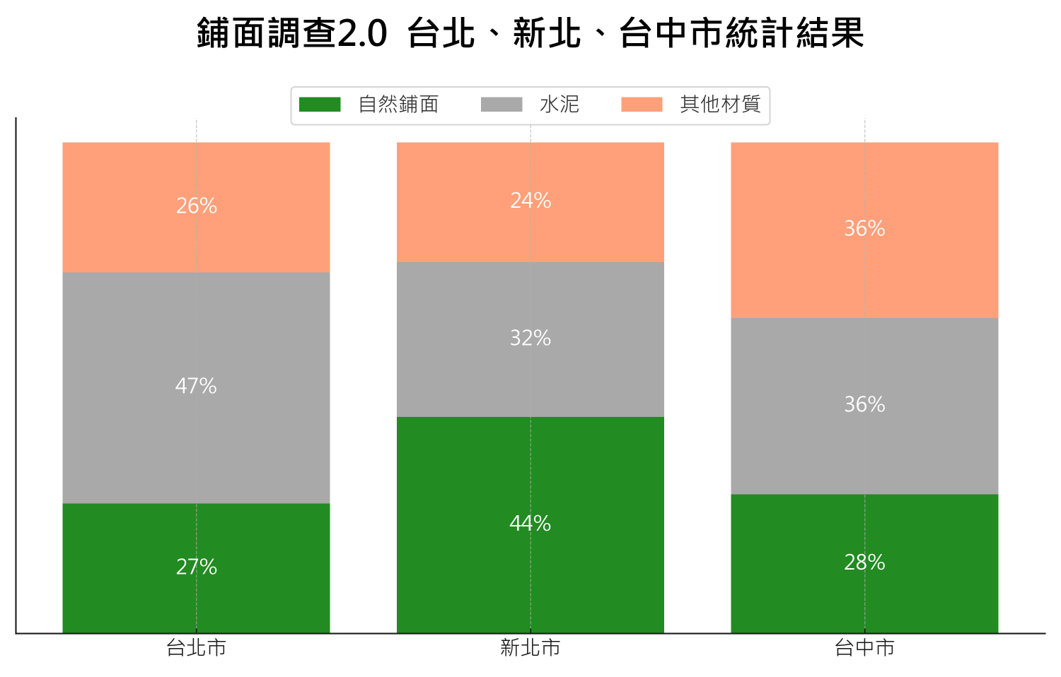 台北市,153條步道,調查總長153.9公里,水泥化比例47%、其他材質鋪面比例26%、純自然鋪面比例27%