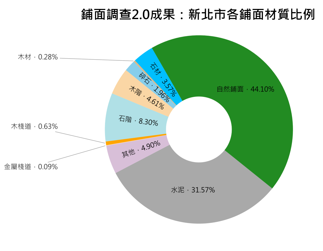 新北市,142條步道,調查總長364.3公里,水泥化比例32%、其他材質鋪面比例24%、純自然鋪面比例44%